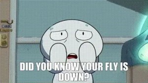 “That’s it!” I’d say. It’s one of those jokes that only works in-person. In a situation comedy, written in, presumably, a writer’s room, how does this get a thumbs up from a head writer? How does the head writer not say, “We can do better than that, c’mon guys. That’s a Friends joke. Surely, we can do better than recycling a Friends joke.” If I were writing this exchange, I would have the butt end of this fly joke say, “Okay thanks,” as he zips his zipper up, “but that doesn’t take away from my observation.” This rebuttal is somehow viewed as one character putting another in their place, and it must be viewed as effective in some quarters, because so many writers write it in as dialogue. Personally, I’d like to have a word with the world to have them help me finally put this insipid “Your fly is down” joke out of its misery.