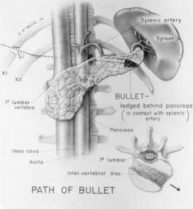 To reassure them that he was able to deliver the speech, he said, “Fortunately I had my [50 page] manuscript, so you see I was going to make a long speech, and there is a bullet—there is where the bullet went through—and it probably saved me from it going into my heart. The bullet is in me now, so I cannot make a very long speech, but I will try my best.”